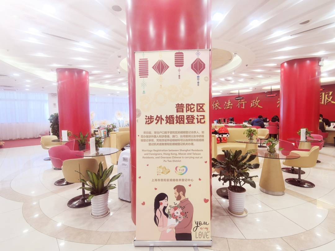 特别提醒:前来登记的新人可以通过随申办市民云APP “婚姻登记预约”等渠道,预约办理涉外婚姻登记。同时,为保证在指定日期顺利办理婚姻登记,建议带好所需证件及相关证明材料提前到普陀区婚姻收养登记中心进行预审、预约。如涉及《取消外国公文书认证要求的公约》缔约国开具的证明材料,为了提高办理效率,建议至少提前10个工作日通过电子邮件(pt62455667@qq.com)向我们发送无配偶证明及其附加证明书,以便我们尽快开展核验。