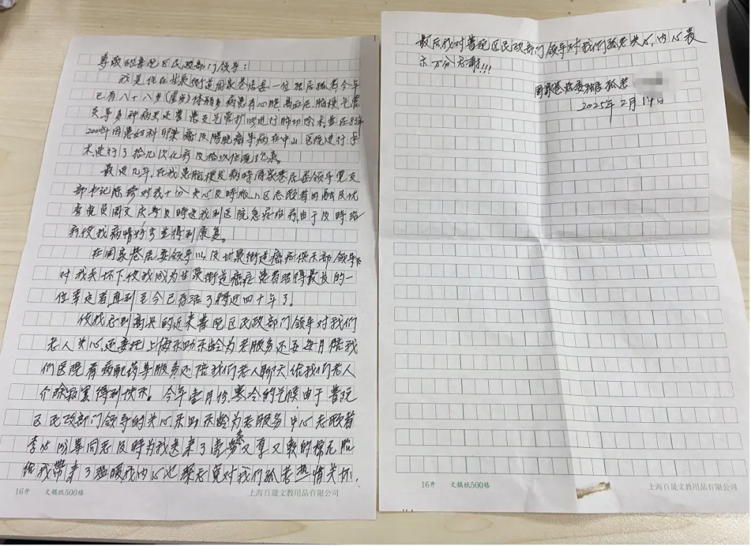 来源: 上海普陀近日,年近90岁的韩阿婆(化名)写下了一封长篇感谢信,并将其交到了区民政部门工作人员的手中,信中字里行间深切表达了她的感激之情,老人娓娓道来那些平凡而温暖的日常关怀,这是对普陀区老年关爱工作的认可与激励。