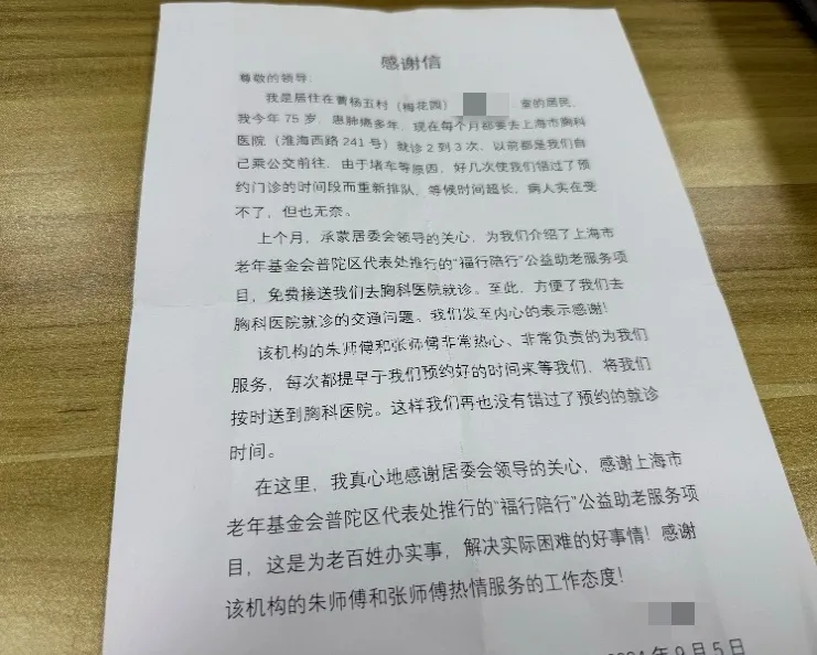 同样感受到项目温暖的,还有曹杨新村街道75岁的曹老伯。罹患肺癌多年的他,每月需频繁往返医院,就医之路曾是其生活中的一大难题。在街道居委的协助下,曹老伯被纳入项目服务名单。亲身体验后,他由衷赞叹这是为老百姓办的一件大实事,切实解决了他的实际困难,并送来情真意切的感谢信,字里行间洋溢着“老有所依、老有所养”的踏实与温暖。