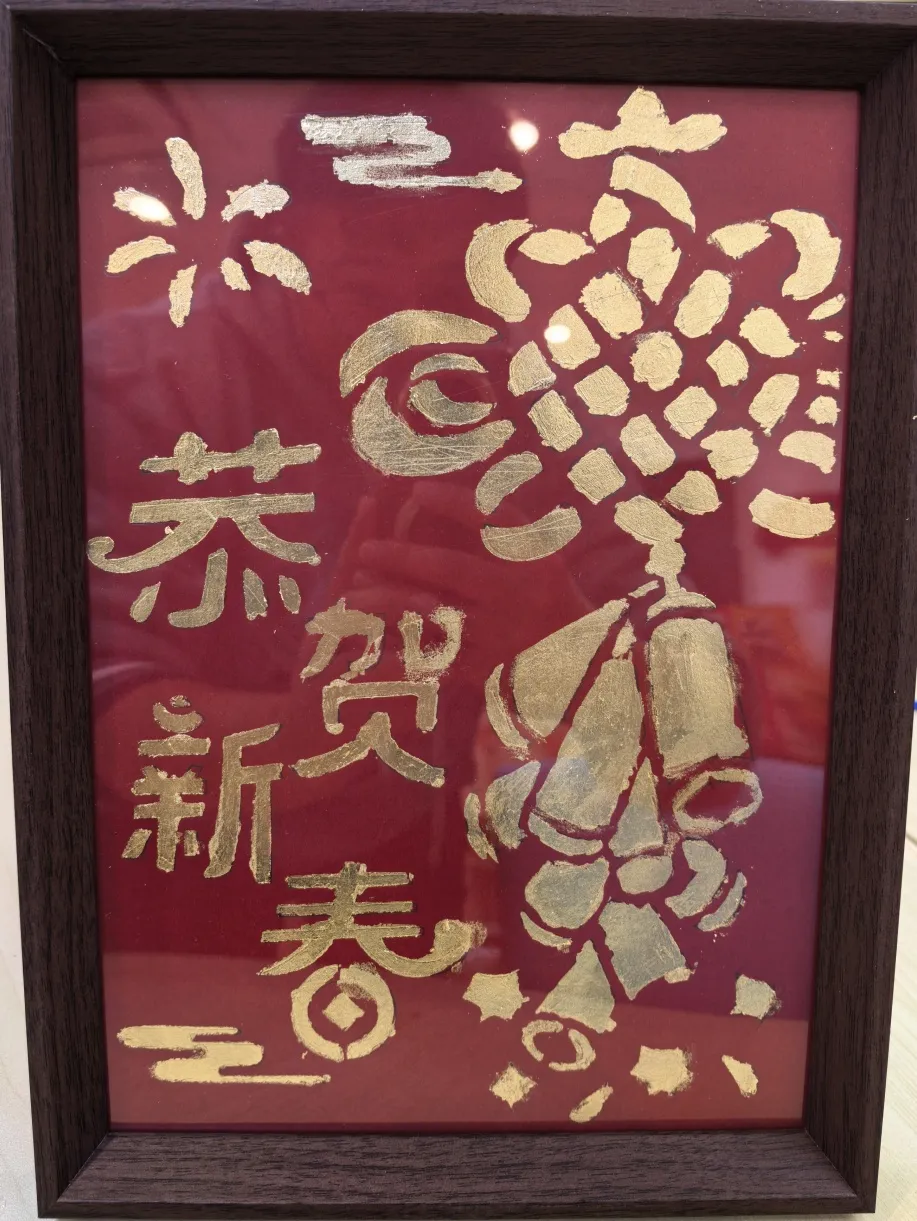 千年传承的金箔薄如蝉翼,孩子们屏息凝神,用镊子轻夹金箔细心粘贴、修饰,将“恭贺新春”“新年快乐”的祝福融入创作。金辉闪耀的画作背后,是孩子们专注力与动手能力的悄然提升,更是在一贴一粘间,对传统工艺匠心的真切感悟,让传统文化的审美素养在孩子们心中慢慢生长。
