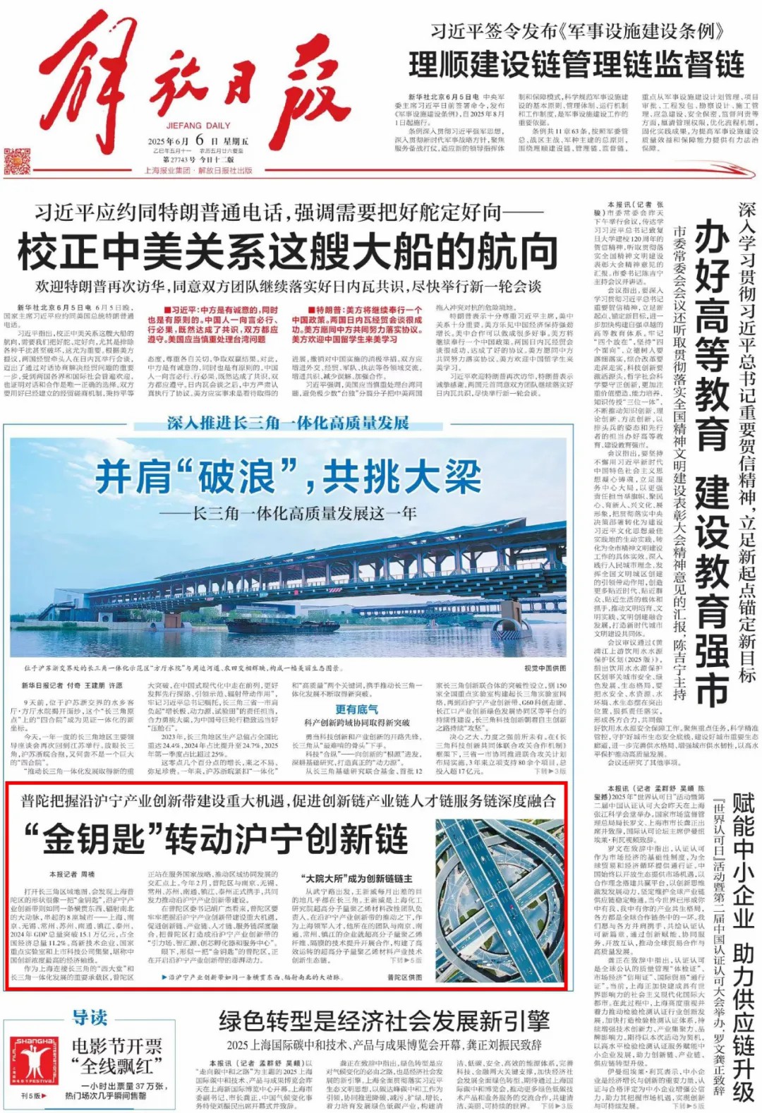 《解放日报》头版关注普陀:“金钥匙”转动沪宁创新链 发布时间:2025年06月06日 来源: 解放日报