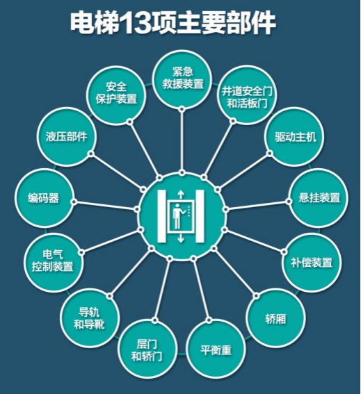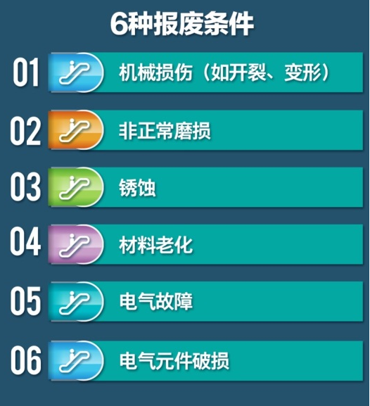 《报废条件》规定了电梯主要部件的报废技术条件,其报废技术条件涵盖了13项对电梯安全运行影响较大的电梯主要部件。根据产品的结构特点,每一项大的部件又细分为若干小的部件给出报废技术条件。