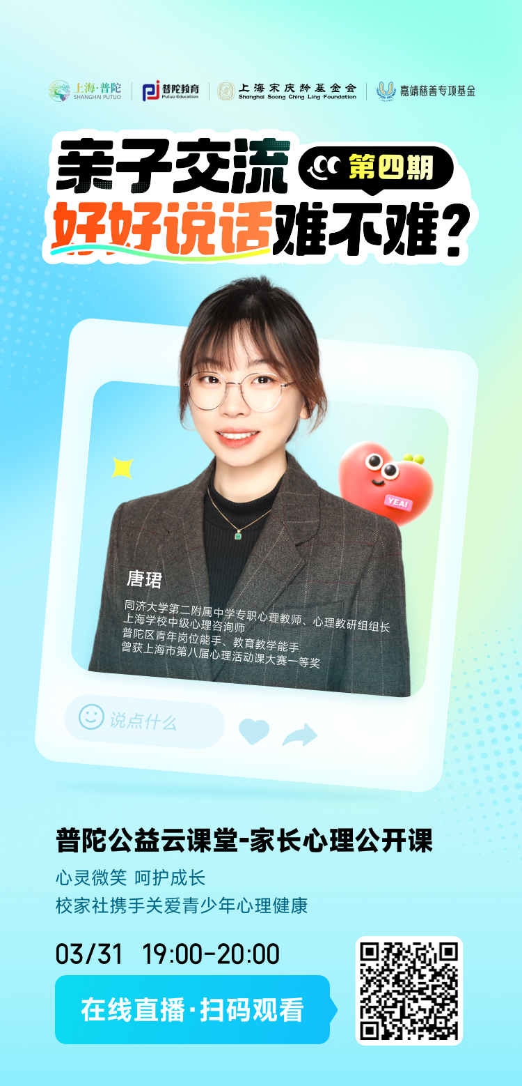 访谈摘要:普陀公益云课堂·家长心理公开课本期将邀请同济二附中专职心理教师心理教研组组长,华东师范大学心理与认知科学院硕士研究生,上海市学校中级心理咨询师唐珺开展关于青少年时期孩子的特点、亲子沟通的关键方法以及家长自我调适主题的讲座,唐老师将和大家一起探讨亲子关系,共同守护青少年身心健康成长。