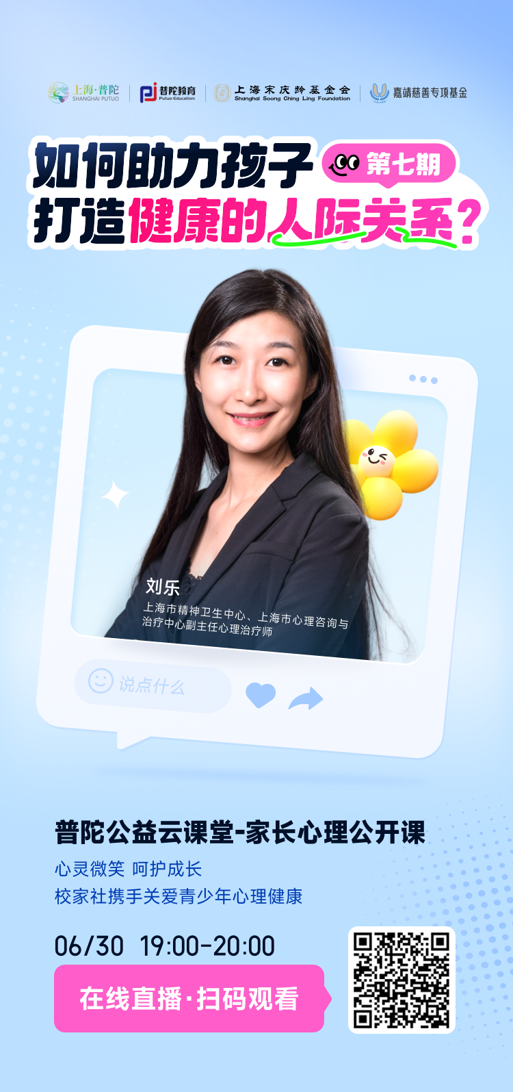 访谈摘要:本期《普陀公益云课堂·家长心理公开课》聚焦的是很多家长都困扰的一个问题:孩子不会处理人际关系怎么办?来自上海精神卫生中心的专家刘乐医生走进课堂,和主持人一起畅聊《家长如何助力孩子应对人际关系》,通过一些实际的案例,让家长们找到帮助自己的孩子和同学和他人良好人际关系的方法,也教会各位家长最实用的小贴士。