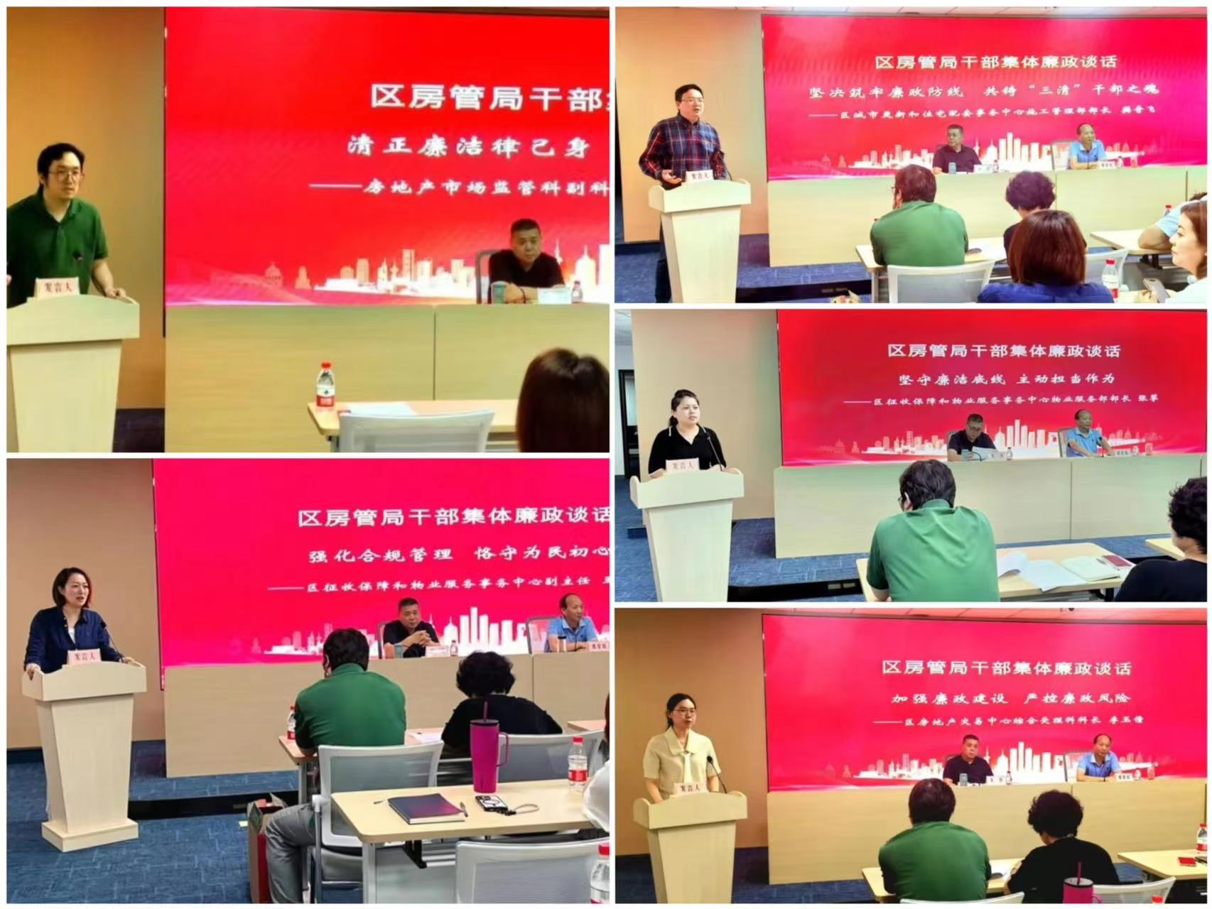与会人员首先观看了警示教育片《蚁贪之害》。来自房地产市场监管科、区征收保障和物业服务事务中心、区城市更新和住宅配套事务中心、区房地产交易中心等科室部门的5名中层干部,分别结合房管业务工作,畅谈了各自业务领域存在的风险点以及如何强化廉洁意识、防范廉政风险的具体措施和心得体会。
