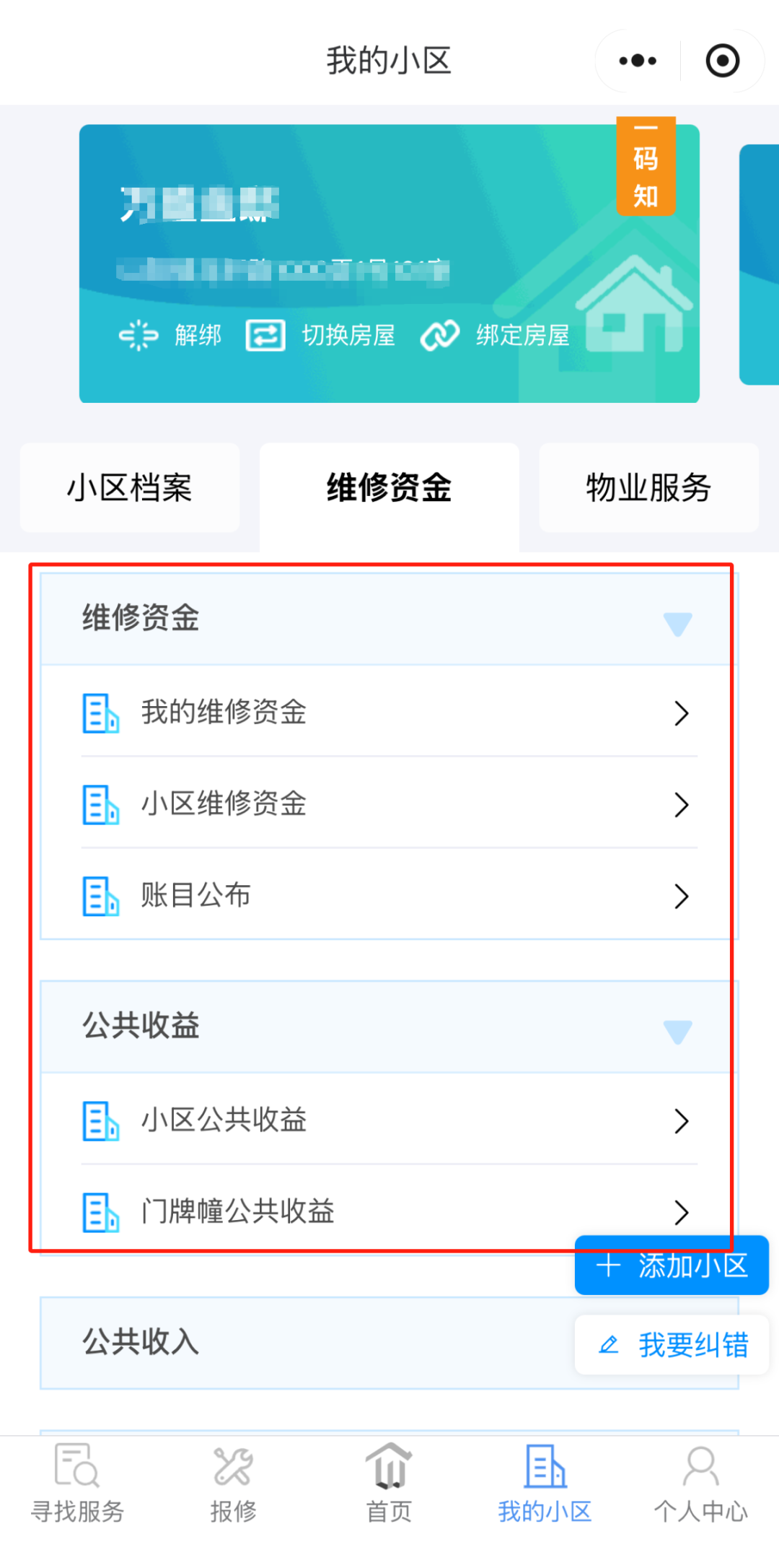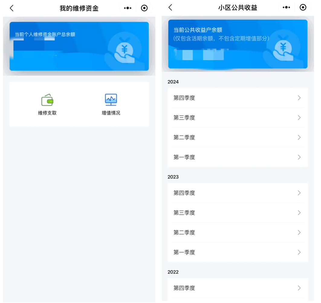 无论是业主个人或是本小区的维修资金余额信息,小区以及单独门牌幢的公共收益余额和公共收益收支公示表都可通过“我的小区”-“维修资金”获取到。