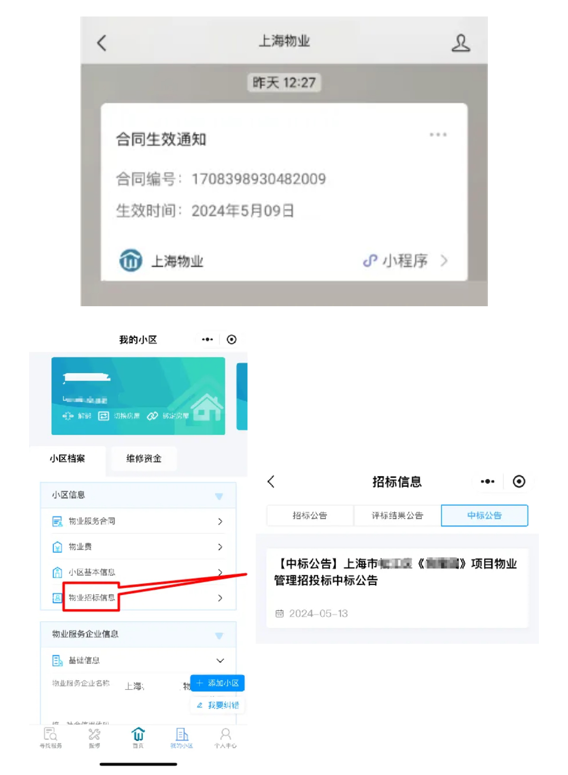 如果小区正在公开招投标选聘物业服务企业,居民还可以实时查看招投标的进程和结果。在“我的小区”-“小区档案”-“物业招标信息”中可查看“招标公告”“评标结果公告”“中标公告”,并了解中标企业情况。