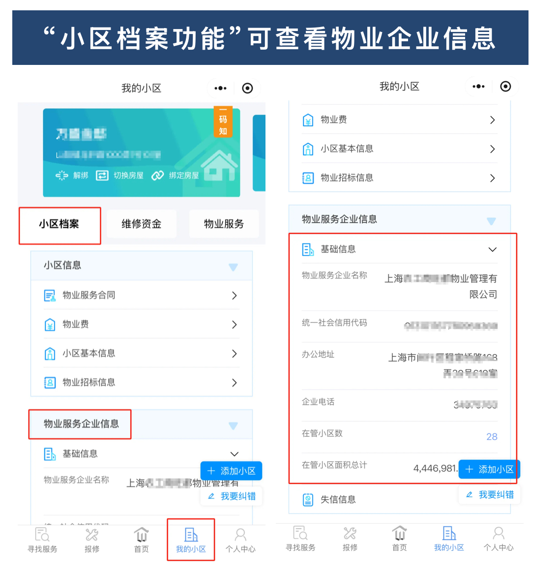 绑定房屋信息后,点击首页“我的小区”-“小区档案”-“物业服务企业信息”,就可以查看小区物业名称、联系方式和办公地址等信息了,还能查看该物业的失信信息情况。