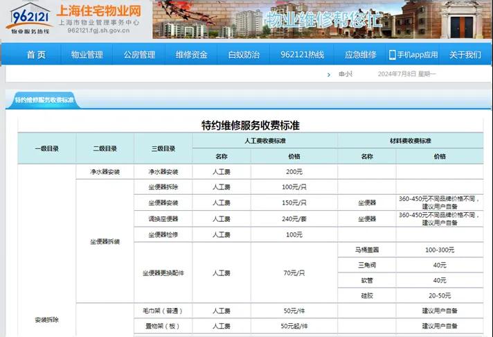 (上海住宅物业网特约维修服务收费标准公示页面截图)
