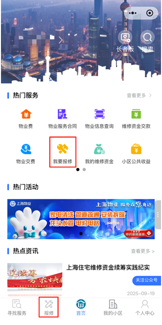 在“上海物业”小程序上绑定房屋信息后,可在首页下方“我要报修”→“特约维修服务”中进行在线预约,并可查看报修进程和历史记录。