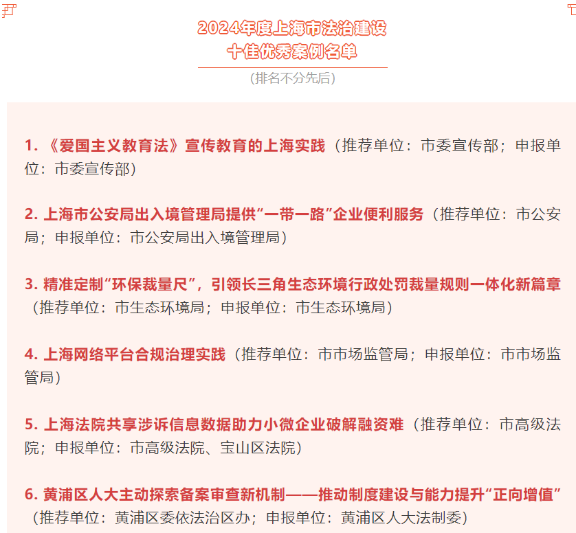 2024年度上海市法治建设十佳优秀案例、十佳提名优秀案例出炉,普陀区《打通法治观察建议落地转化“最后一公里”普陀区发布全市首部既有住宅换梯软法指引赋能基层依法治理》案例荣获2024年度上海市法治建设十佳优秀案例。