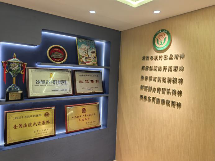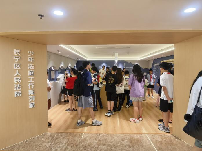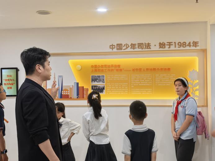不同于传统法庭的庄严肃穆,长宁法院打造的青少年法治教育基地以暖色调和互动化设计重新定义了法律的温度。孩子们在金老师的带领下首先走进少年法庭工作陈列室,在“理念柱”前驻足,这根刻画着“一切为了孩子,为了孩子的一切。”的光柱,串联起长宁法院少年审判41年的发展脉络。从1984年全国首个“少年犯合议庭”的成立,到“社会调查”“犯罪记录封存”等全国首创机制的诞生,孩子们通过实物展品、历史影像和互动屏,见证了中国少年司法从萌芽到蓬勃的全过程。