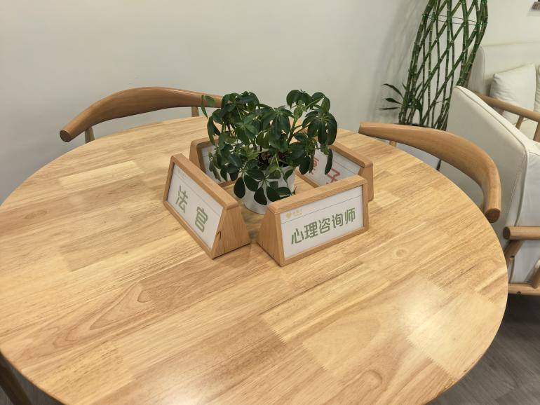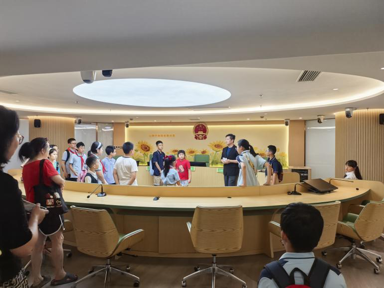 随后,孩子们参观了“圆桌法庭”、“心理咨询室”等特色区域。当他们走进少年圆桌法庭时,圆顶、圆柱、圆桌构成的环抱式空间让大家眼前一亮。向日葵图案的背景墙暖意融融,圆形审判台消解了距离感。金老师向大家介绍:“这面玻璃幕墙有玄机,” 随后轻轻触碰控制面板,透明的玻璃瞬间雾化,“开庭时保持透明接受监督,涉及隐私时一键雾化,既讲法理也讲人情。”