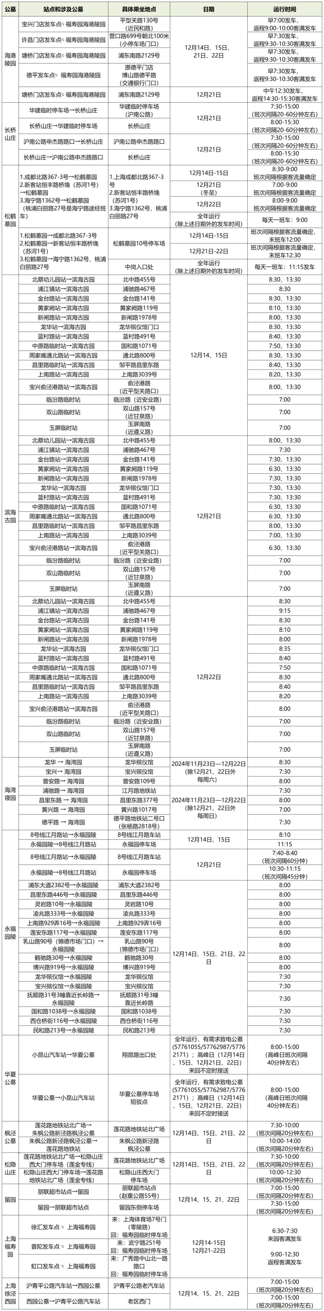 2024年本市部分公墓冬至祭扫定点班车安排表