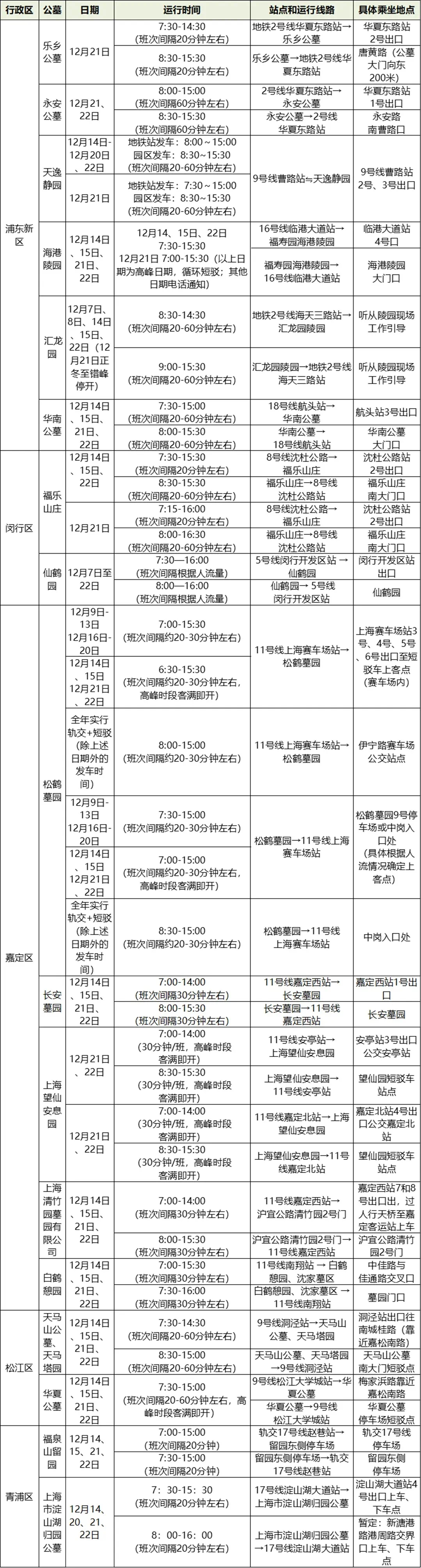 备注:1、短驳车20~ 60分钟左右一班,高峰时段客满即开,12月21日(正冬至)上午8:30~ 10:30,各轨交站点祭扫客流相对集中,建议市民错峰出行;2、市民对上述信息有疑问的,可直接向相关公墓咨询。