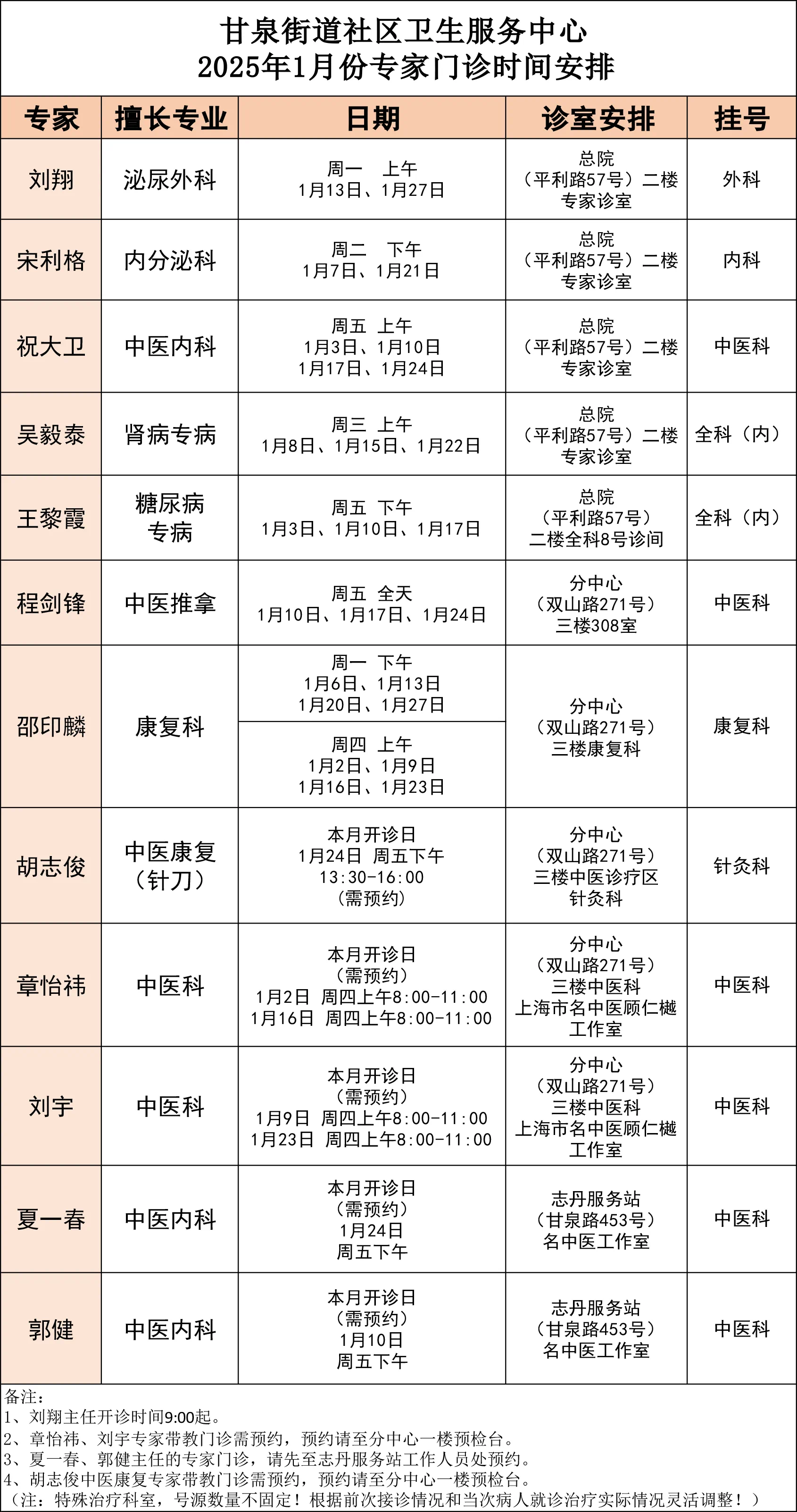 【泉心小贴士】2025年1月专家门诊安排