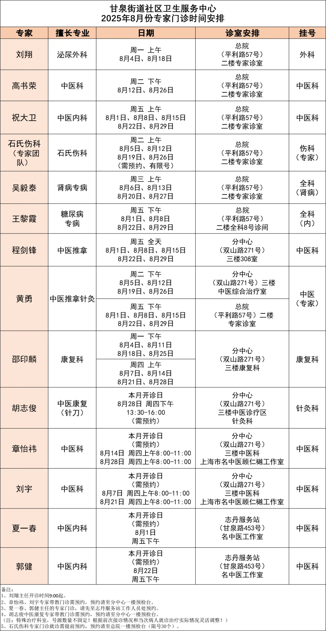 【“泉”心小贴士】甘泉社卫2025年8月专家门诊安排请查收