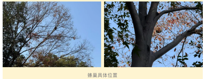 近日,甘泉路街道甘泉网格片区接12345投诉,甘泉苑小区幼儿园旁的一棵大树上高悬着一个马蜂窝,其位置正对着小朋友们户外活动的场地,虽然目前已经是冬季,马蜂活动受限,但是仍然会对小朋友带来安全隐患。幼儿园只得向街道城运中心求助,看是否可以趁冬季马蜂活动较弱的时候,铲除蜂巢,杜绝隐患。