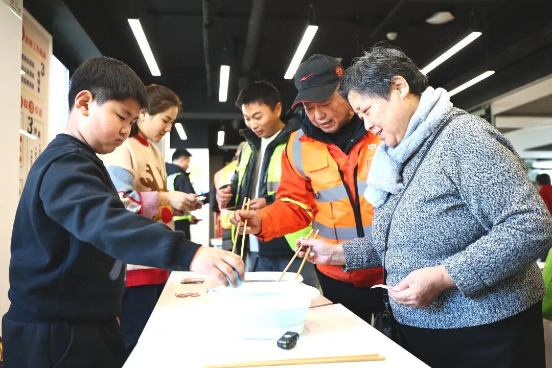 随后进行的“集五福”互动游戏将现场变成了欢乐的海洋。钓鱼、夹“元宵”、齐心合力……这些充满童趣又寓意吉祥的游戏,让平日里手持工具、神情专注的工友们彻底放松下来,展露出活泼的另一面。在“夹元宵”用长筷夹乒乓球游戏区,年近六十的工友田庆于手法利落,成功通关,赢得了阵阵掌声。他兴致勃勃地和身旁的居民分享起老家的年俗:“年夜饭一定要有鸡有鱼,大吉大利,年年有余嘛!还要吃汤圆,团团圆圆。包饺子那是图个热闹氛围,还得有苹果,平平安安!”尽管今年无法返乡,但眼前的热情让他感慨:“在上海过大年,过一个上海的新年,上海人很热情,很好!看社区老年人表演舞蹈,心里非常高兴。”