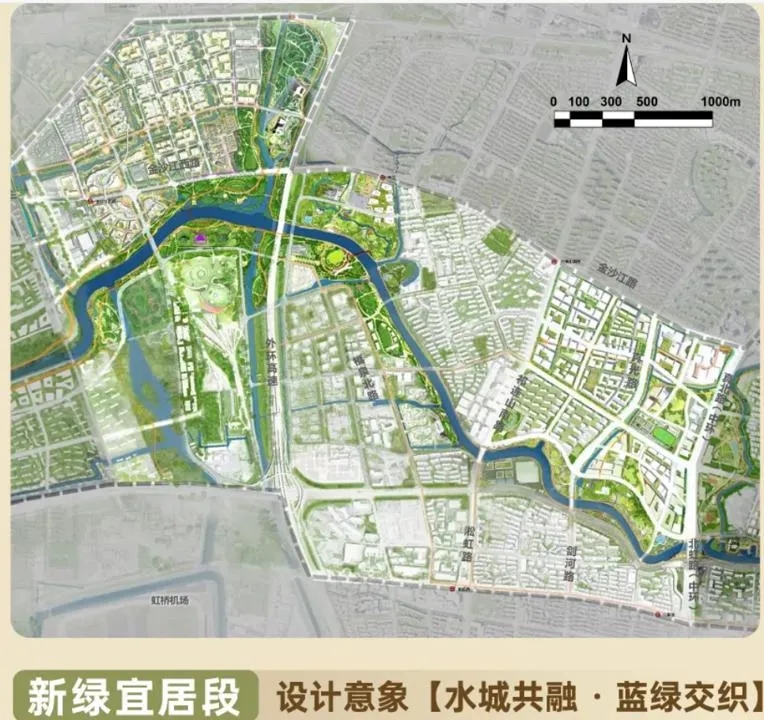 生态创新段东起外环吴淞江桥西至嘉松北路吴淞江桥,规划探索蓝绿筑底、湿地入城等空间形态,打造人与自然融合共生的环境,展现江南人文意蕴的新兴科创滨水区。