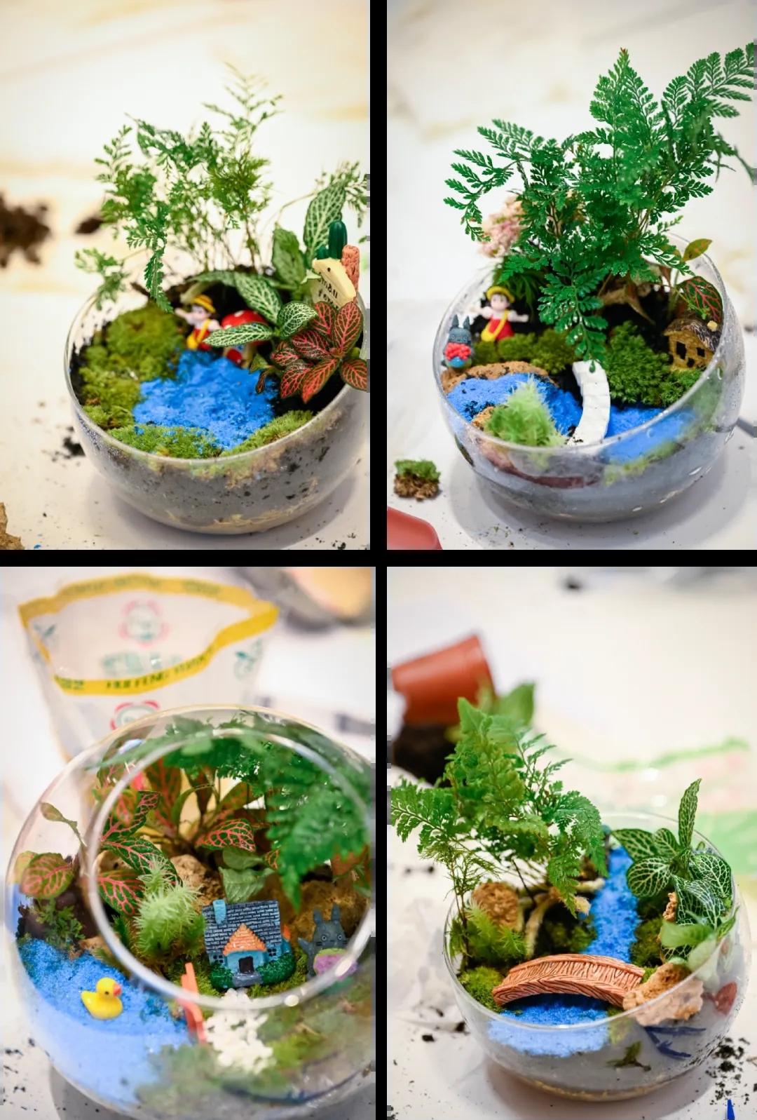 最终,一批创意满格的微景观作品惊艳亮相,风格各异且异彩纷呈。有的家庭将卡通人物、模型小屋与多彩植物巧妙融合,打造出梦幻绚丽的童话场景;有的则以凉亭、木桥与假山石为元素,营造出中式庭院“小桥流水”的雅致意境。尽管未经过专业设计训练,孩子们依然凭借丰富的想象力、出色的创造力和娴熟的动手能力,设计出了诸多令人惊喜的艺术小品。