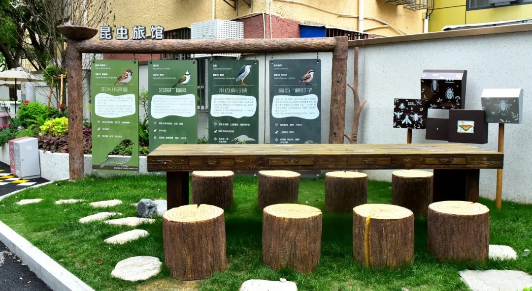 这里更是鲜活的科普天地,绿荫下“昆虫客厅”陈列的标本箱,吸引孩子们探索;疗愈花园推行“共享植物”——居民可领养多肉,待萌发新芽再送回一部分;在今年的国际生物多样性日,这里更揭牌成为上海市宜川中学及其附属学校的“自然生态校外实践基地”。