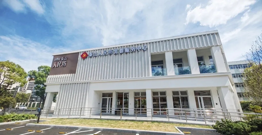 处于“人”字形道路交叉点的核心位置,原先是公共浴室和零星早餐铺的区域,变身为明亮时尚的“泰山人民坊”主体建筑。这座700多平方米的党群服务中心集纳了红色议事厅、社区图书馆、多功能活动区、宝宝屋等,实现全龄友好。记者采访当天早晨8点多,里面已坐满了前来纳凉的老人和看书、做作业的孩子。