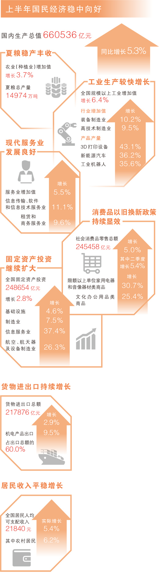 国内生产总值(GDP)增长稳中有升。初步核算,上半年GDP为660536亿元,同比增长5.3%,比去年同期和去年全年均提升0.3个百分点。