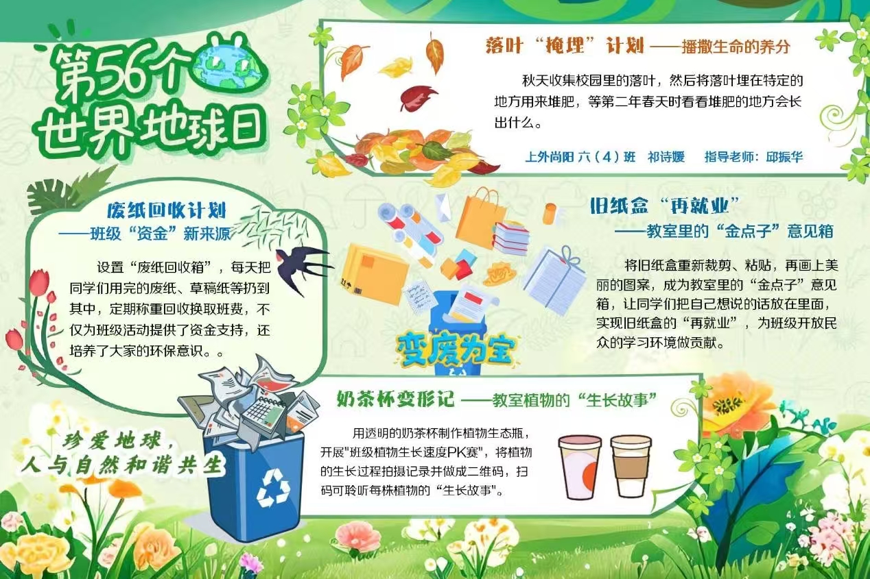 紧扣世界地球日、六五环境日、全国低碳日等节点,各学校常态化开展形式多样、内容丰富的主题宣传活动,如“垃圾分类新时尚”“践行光盘行动”“变废为宝时装秀”等,引导学生树立绿色低碳环保理念。梅陇中学、新普陀小学西校、真如文英中心小学以“志愿服务”为抓手,开展“每日捡垃圾活动”“垃圾分身术体验活动”“半马苏河Citywalk活动”,动员师生走进社区、市场,宣传环保“无废”知识;万里城实验学校和上海外国语大学尚阳外国语学校则分别通过设置“100件可持续小事”展示墙、环保服装科技秀,生动传递变废为宝的“无废”智慧;同济大学第二附属中学开展的垃圾分类趣味运动会、分类知识抢答赛,让学生在轻松愉快的氛围中学习并掌握垃圾分类知识。