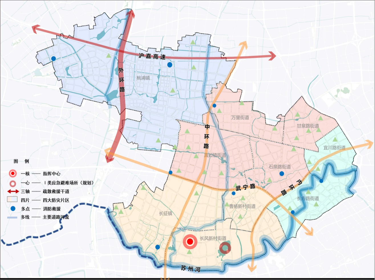 三轴四片:“三轴”——陆域疏散救援主干道(外环高速)、陆域疏散救援次干道(沪嘉高速)、水域疏散干道(苏州河);“四片”——四大防灾片区,即中部真如城市副中心拓展防灾片区、西部桃浦智创城战略储备防灾片区、南部商业商务核心承载防灾片区、东部滨水生态休闲防灾片区;