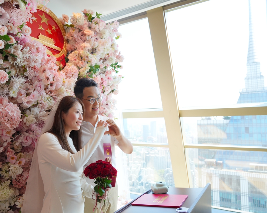 5月19日,上海环球港258米观景平台作为全市最高户外婚姻登记点启用。通过前期开放预约,当日共有8对新人赶来“尝鲜”,在云端登记,见证属于自己的幸福。