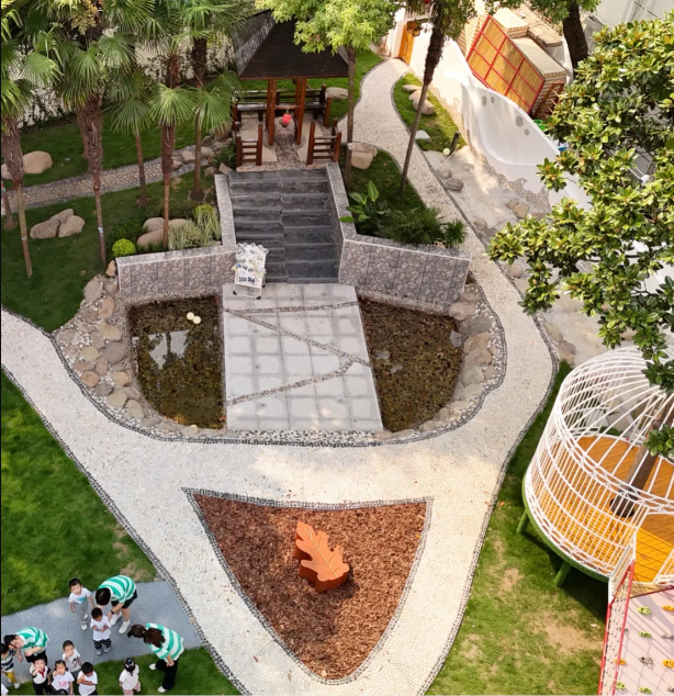 孩子们的兴趣和对水源的探索需求,引导着幼儿园在改造过程中将水元素融入每一个角落。从水井、小瀑布、池塘,到沟渠、农庄、山坡,幼儿园借助从上而下的地势和隐藏的地下水源,设计了一条潺潺流水,为“口袋森林”注入了灵动与生机。这条“流动的水”穿梭于整个操场,使得每个区域的孩子都能根据对水的需求,自由地游戏、探索、灌溉、清理,全方位体验水的丰富功能和自然之美。