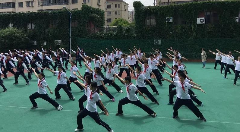 新杨中学根据近年来学生人数不断增加、场地有限的实际,积极应变,充分利用校园每个角落,巧妙规划大课间活动。学校把大课间活动的区域划分为分项区域和集体活动区域两部分。集体活动区域的内容主要包括进退场、广播操、跑操等,分项活动区域的内容有篮球、跆拳道、跳踢拍、啦啦操等,各区域的活动都安排专职体育教师负责。通过灵活组织、分区管理,确保每位学生都能积极参加体育锻炼活动,增强体质。