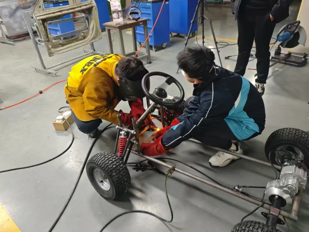 在制造小车时,他们遇到了重重困难,比如车子宽度超标、电池不匹配等问题。但在老师的悉心指导下,学生们积极思考,通过将后轮驱动轮的轴两端各缩短五厘米并更换轮胎,以及利用升压器将12V电压提升至48V等方法,成功让小车顺利启动,为后续的比赛环节奠定了坚实基础。