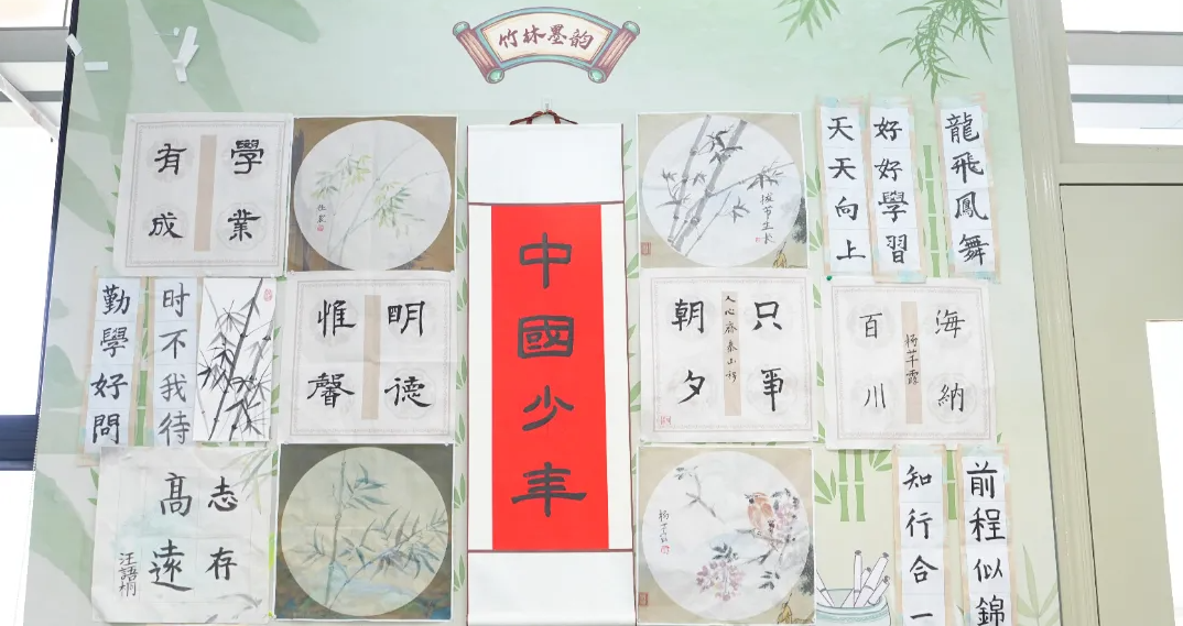 教室中构建了立体文化矩阵与交互成长空间,每一面墙壁都生长着文化的根系,让翰墨竹韵在指尖流转成育人的诗行。
