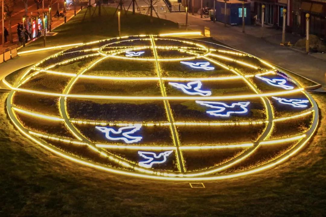 实施街区景观建设,营造靓丽街景。普陀绿化市容工作者持续推进景观道路(美丽街区)建设任务,通过实施道路沿线绿地调整改造、景观照明设施提升等举措,全要素提升区域街景能级。例如,在金沙江路(中山北路—真北路),道路两侧的景观树灯如同五彩斑斓的蝴蝶,灯光亮起时,轻轻煽动翅膀,寓意着普陀转型“蝶变”。而位于金沙江路真北路西南角的3D地球转角绿地,则引入裸眼3D的视觉艺术手法,一到夜间,灯光进一步强化了立体感,呈现出流光溢彩的视觉效果。