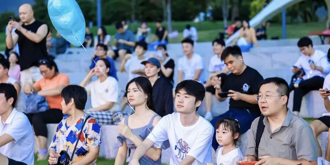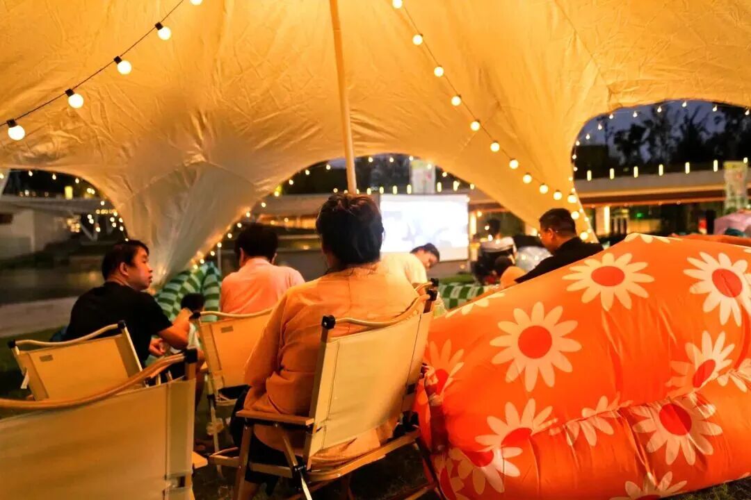 傍晚时分,露天电影《飞驰人生》如期放映,吸引全年龄段的观众驻足。有一家子围坐在露营桌旁笑语不断,有年轻情侣相依在充气垫上共享温馨,还有市民带着爱犬前来——一只一岁的巨型贵宾犬活泼亲人,摇着尾巴在人群中穿梭求抚摸,引得不少市民俯身互动。