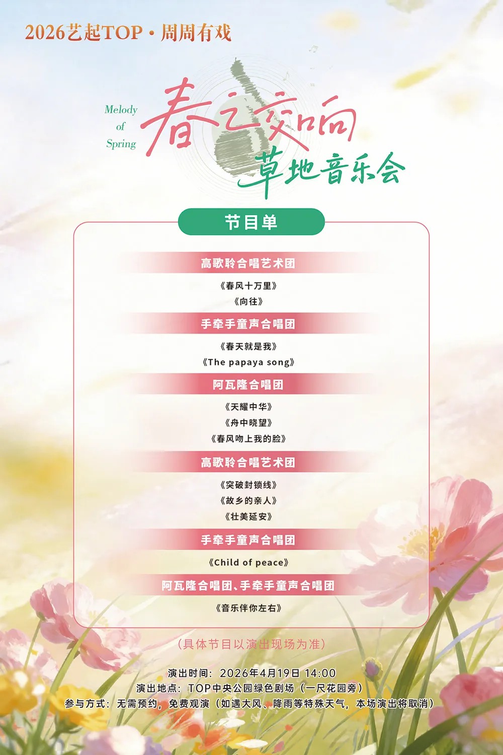 4月19日(周日),艺起TOP·周周有戏——“春之交响”草地音乐会第五场将在桃浦中央公园绿色剧场继续上演。