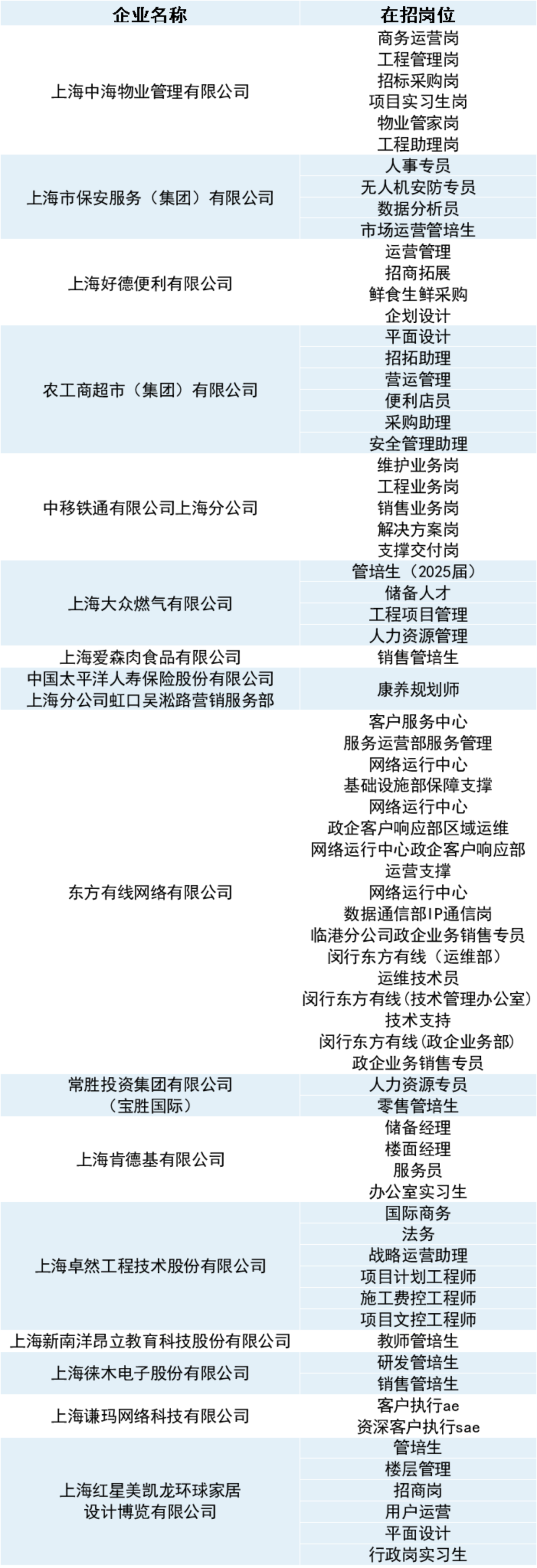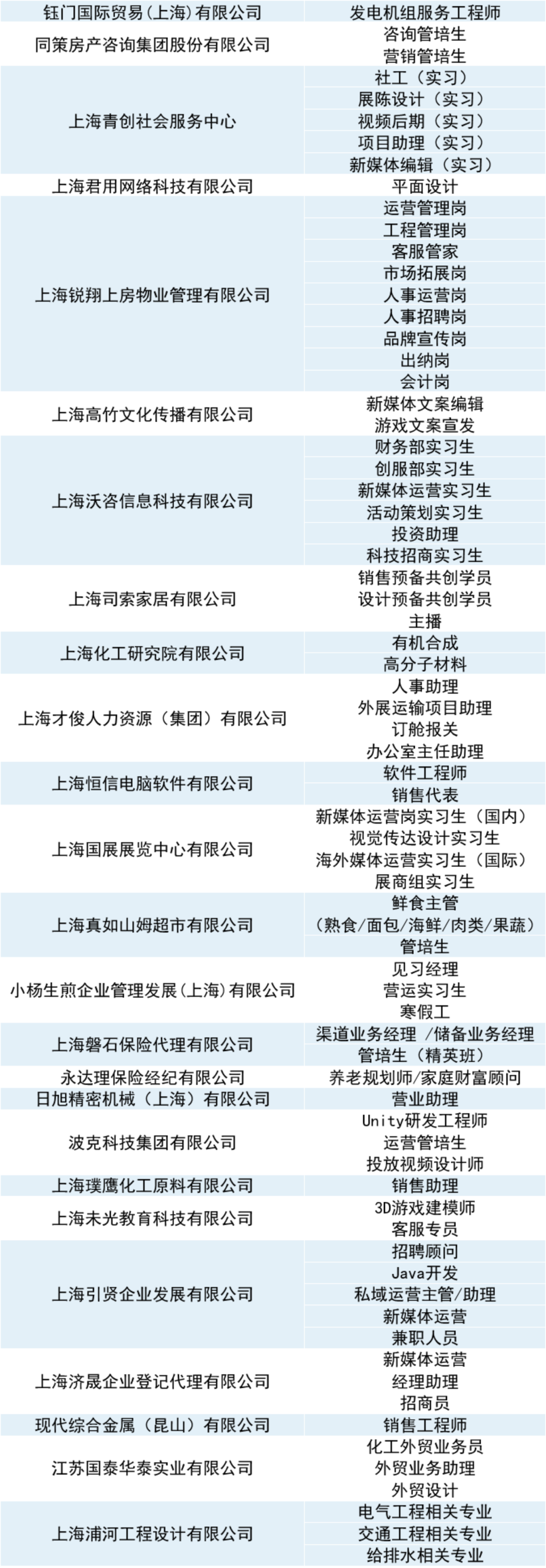 为全面贯彻党的二十大精神,落实党中央、国务院关于促进高校毕业生等青年就业的决策部署,强化高校毕业生等青年群体就业服务,畅通求职招聘渠道,促进人岗精准匹配,“苏河扬帆 职通未来”普陀区2024年高校毕业生就业服务“扬帆”专项行动上海工程技术大学专场招聘会惊喜来袭! 70余家用人单位 数百个优质岗位 最高月薪2W+ 就在9月20日 实力国企、上市企业 更有知名高新技术企业 专精特新企业等你来 机遇满满不容错过 活动安排 活动时间 2024年9月20日(周五) 下午13:30-15:30 活动地点 上海工程技术大学 (松江校区 龙腾路333号) 机械与汽车工程学院 感兴趣的小伙伴们速速下翻 抢先了解当天部分企业招聘详情 部分招聘名录 更多岗位和招聘会信息 敬请关注“乐业普陀”微信公众号