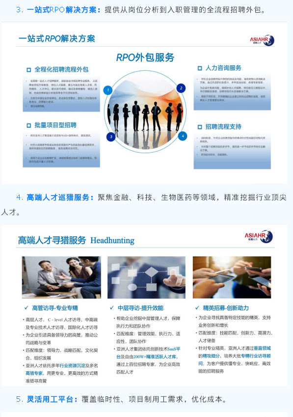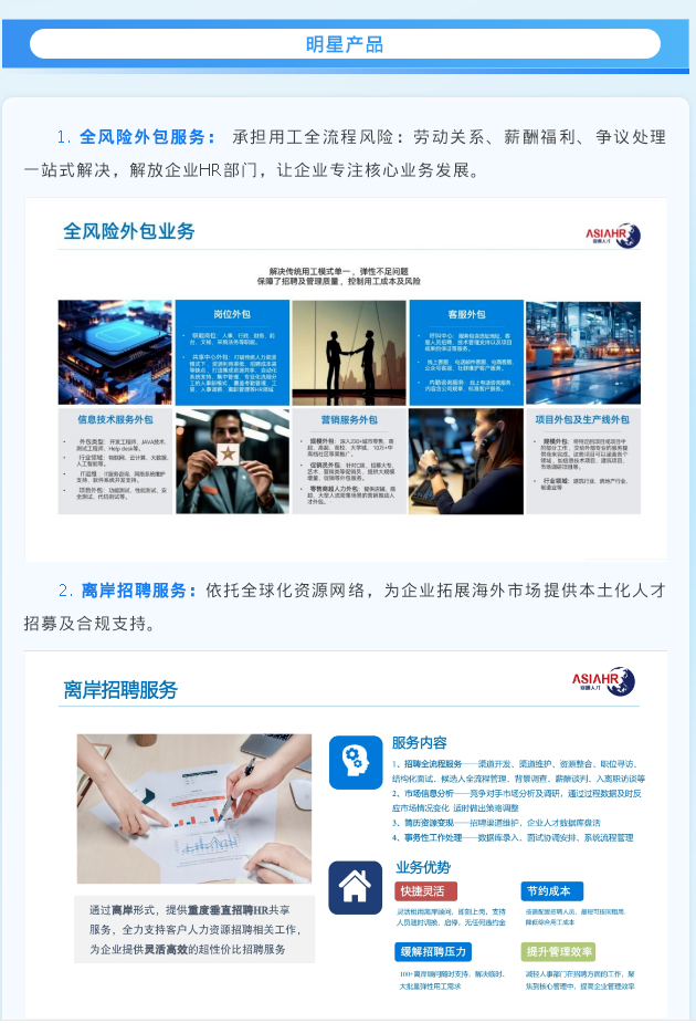 亚洲人才集团ASIAHR成立于2003年,是首批获得政府批准的中外合资人力资源外包服务商。总部位于中国上海,国内覆盖全国400个服务网点,海外涉及东南亚多地区,包括越南、泰国、柬埔寨、马来西亚 、新加坡、印度尼西亚等。服务领域涉及电子商务、物流、房地产、金融、物业、电子通讯、服装零售行业及快速消费品行业,在多个行业累积大量客户经验,获得多领域头部客户认可及口碑。 公司本着“以人为本,客户至上”的服务理念,采用“一地、一次委托,全地域、全程服务”的服务模式,致力于为客户提供优质、核心、高效的人力资源个性化解决方案。2024年被中国招投标网评为AAA级信用企业,2025年成为中国招投标领域入库供应商。