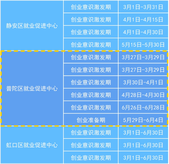 为提升劳动者就业创业能力,促进劳动者成功创业并通过创业带动就业,本市发布了《上海市人力资源和社会保障局 上海市财政局关于加强创业培训提升全过程创业能力的实施意见》(沪人社规〔2025〕30号)文件,遵循创业活动的规律,开展覆盖创业意识激发期、创业准备期、创业初创期、创业发展期等不同阶段的创业培训。 一、创业意识激发期、创业准备期 培训主体:各区就业促进中心 培训对象:本市有创业能力提升意愿和培训需求的各类劳动者,重点面向本市各类职业院校和高校在校学生、退役军人、残疾人和即将刑满释放人员等群体。 培训费用:免费(不含食宿) 课程介绍: (一)标准课程 产生你的企业想法(GYB):旨在帮助创业者了解什么是企业和企业想法,分析评估是否适合创业,掌握产生企业想法的方法,并筛选出适合自己的创业项目。 创办你的企业(SYB):旨在帮助创业者在培训过程中演练开办企业的各个步骤,完成自己的创业计划书,建立有生存能力的小微企业。 (二)精品课程 聚焦上海重点产业、战略性新兴产业和区域特色资源,开展适配创业者实际需求的创业培训精品课程,现已开发聚焦跨境电商、数字文创、科技创业等行业,针对退役军人、社区创业者等重点群体的精品课程,更多课程正在持续建设中。 二、创业初创期 培训主体:具有相关资质的创业培训机构 培训对象:本市有意改善创业组织经营情况的已创业者 培训费用:按市场价格定价,对于获得创业初创期培训合格证书的,给予个人培训费补贴1800元/人。 课程介绍: 改善你的企业IYB:旨在帮助小微企业主学习制订和实施市场营销计划、核算产品成本、有效控制采购投入、管理企业存货、建立基本的记账体系,形成企业改善计划,提升企业经营管理能力。 三、创业发展期 培训主体:市、区就业促进中心 培训对象:有意扩大企业规模的创业者,重点面向已获得创业大赛奖项或风险投资机构投资的企业负责人 课程介绍: 扩大你的企业EYB:旨在帮助企业主系统地学习前沿的企业战略管理课程,围绕企业现状分析、战略路径规划、核心竞争力提升等核心内容,制订一套可行的企业增长战略计划。 马兰花创业培训2026年上半年开班计划 (以各区实际举办为准) 报名方式: 有培训意向的学员可联系各区公共创业指导服务部门咨询报名,或扫描以下个人创业一件事二维码,点击“创业培训报名”在线提交培训需求,各区公共创业服务部门将主动联系,根据实际情况遴选通过后可参加培训。 2026年普陀区GYB培训班即将在3-4月火热开班 欢迎各位创业者积极报名参加 ↓ 有意向者可提前致电预留信息 ↓ 普陀区就业促进中心创业指导科 咨询电话:021-66118901 来源:上海市人力资源和社会保障