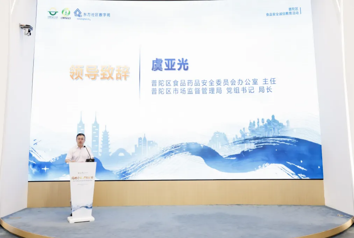 区食药安办主任、区市场监管局局长虞亚光在致辞中表示,普陀区将全面落实“两个责任”,持续强化食品安全全链条监管,不断拓宽群众参与食品安全治理的渠道,营造人人关心、人人参与、人人受益、人人共享的食品安全良好氛围。