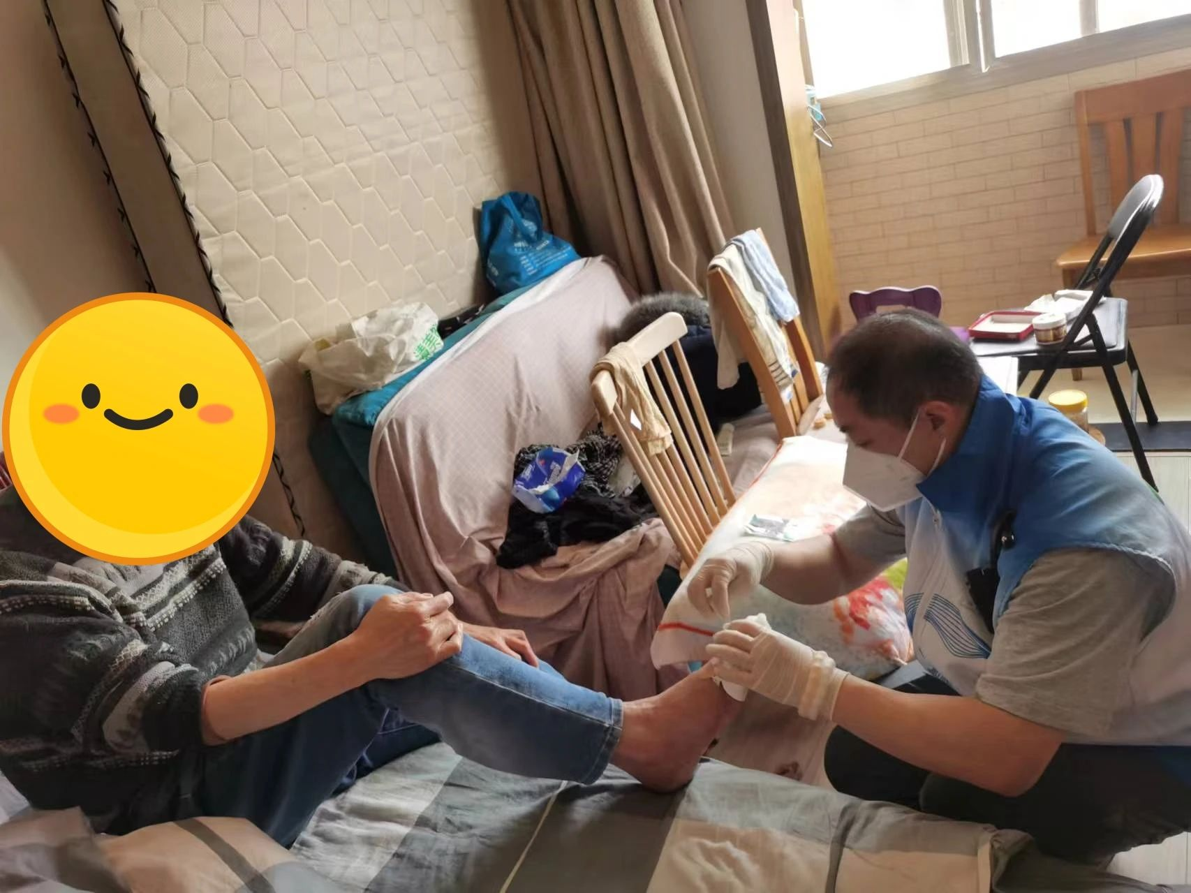 接到消息后,党员社工裘一波第一时间带上消毒药品和手套立即到现场查看,发现老人纱布位置包扎在整个脚趾处,多移动极容易导致纱布松动。他立即为老人固定好纱布,并叮嘱老人不要多移动脚底部。