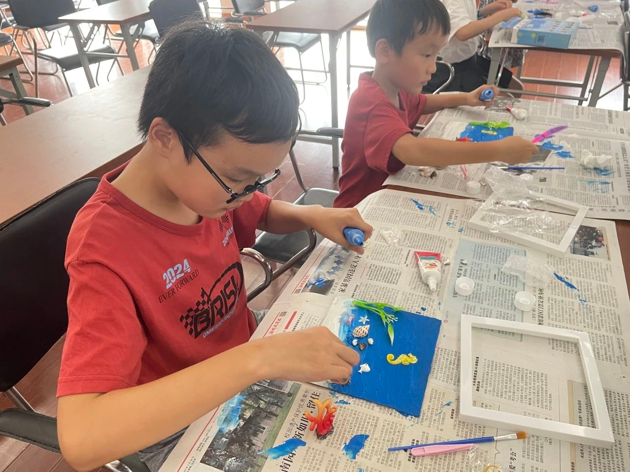 学生们化身小小艺术家,用五彩斑斓的颜料为相框添上绚丽的色彩,在背景板上巧妙地粘贴上形态各异的珊瑚、摇曳生姿的水草、悠然自得的乌龟以及活泼可爱的小鱼,一幅幅微型的海洋世界在他们的巧手下栩栩如生。“我要带着这个‘海底世界’回家,和爸爸妈妈一起分享我的创作,继续探索更多神奇的海底秘密!”学生们高举着自己精心制作的海洋相框,脸上洋溢着满满的成就感与喜悦之情。