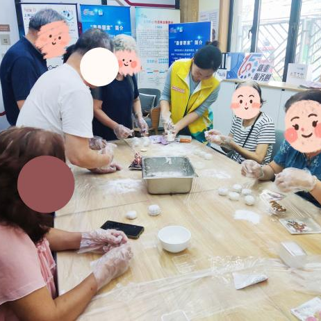 创意工坊内,桌上的冰皮粉、馅料、模具等材料已准备就绪,工作人员细心地讲解着月饼的制作工艺,从馅料的用量与搭配,到包裹、压模的技巧,每一个步骤都颇有讲究。居民们迫不及待地动手操作起来,小心翼翼地将馅料包进面团中,揉成球状、用模具压出形状。制作过程中欢声笑语不断,“我这个月饼做得怎么样?”“哎呀,你的比我做得好多了。”大家你一言我一语,互相交流着制作心得。在社区这个充满爱与温暖的大家庭中,共同享受劳动带来的乐趣和成果。