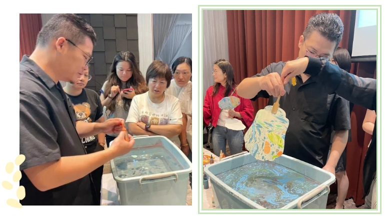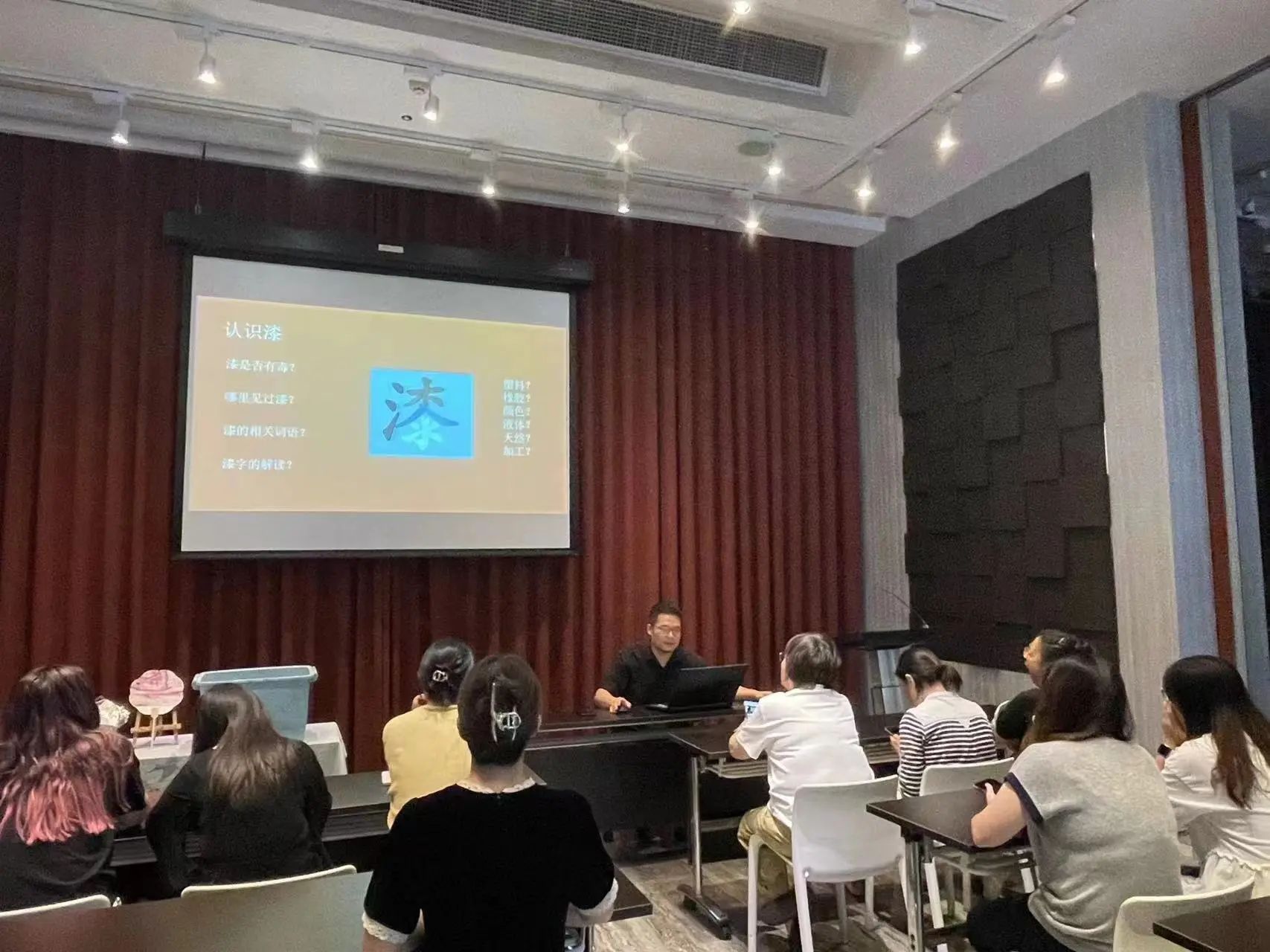 活动采用互动交流的形式,让大家能够直观地领略漆艺艺术的发展历程与文化内涵。讲解环节结束后,职工们纷纷动手实践,他们首先将精心挑选的漆滴颜色滴落在清澈的水面上,静待那些绚烂的漆滴在水面上自由扩散,形成独特的图案。随后,每人手持一把洁白的扇子,轻巧地用它在水面上轻轻搅动,利用这一过程中纹路形成的随机性,创造出一件件独一无二的艺术佳作。
