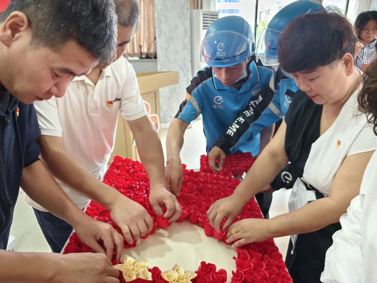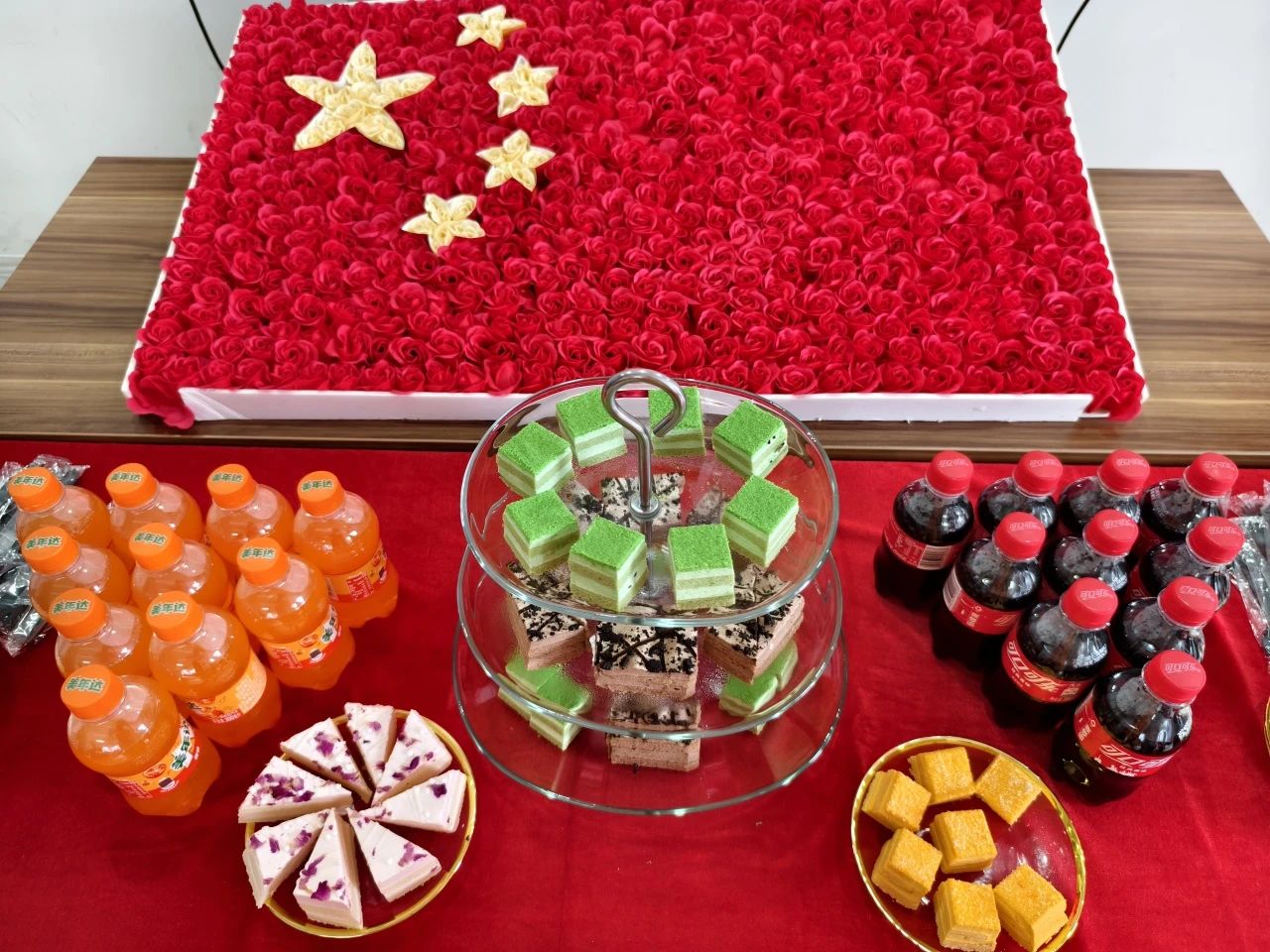 活动还为大家安排了一个点燃氛围的“高光环节”,与会人员通过团队协作、配合分工的形式共同完成了以玫瑰花组成的大型国旗图案。在大家的精心制作下,一个个鲜艳绽放的花朵被拼接起来,成为了五星国旗的一部分,每一个细节都包含着大家对党、对祖国的浓浓爱意,效果十分震撼。
