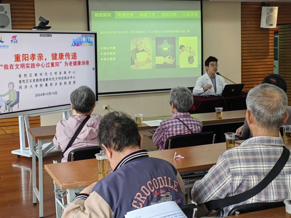 普陀区新时代文明实践中心携手石泉路街道新时代文明实践分中心,联合同济大学附属同济医院团委,开展“重阳孝亲,健康传递”——“我在文明实践中心过重阳”为老健康讲座。此次讲座围绕“睡眠质量”与“糖尿病营养管理”两个方面,旨在传递科学的养生知识,改善老年人的生活质量。