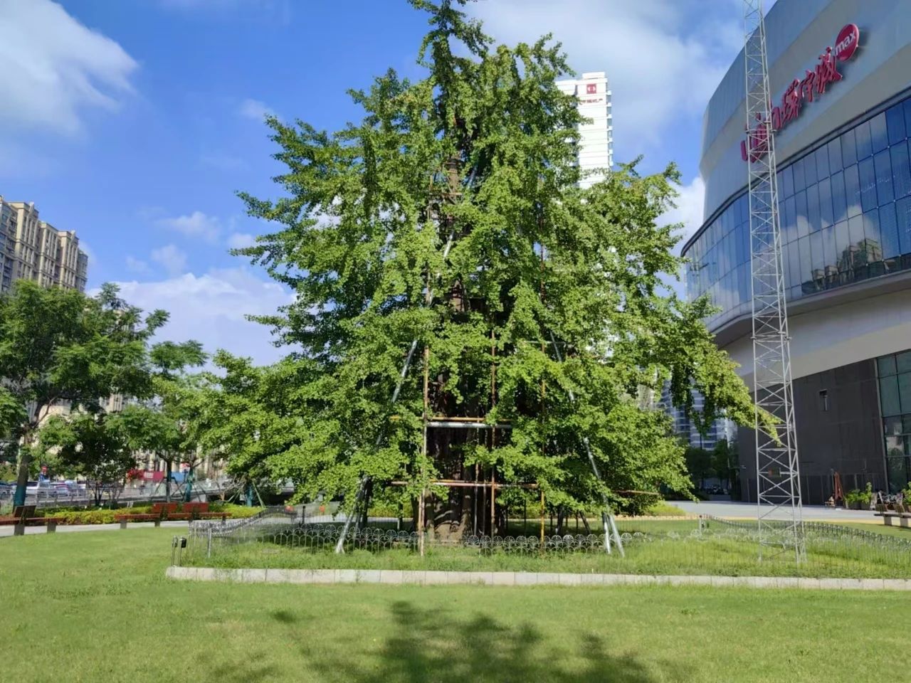 这棵银杏树编号为0057,高18.5米,胸围2.7米,冠幅东西向和南北向各9米。别看眼前这棵银杏树嫩绿如新,其实历经了500多年的岁月变迁。为了让古树名木“老有所依”,在街道林长办的精心组织下,每月定期开展古树巡查,指导古树养护单位园开公司实施专业养护。2023年底,随着中海环宇城max的盛大开业,银杏树周边环境焕然一新,被精心打造成为银杏广场,为市民提供了一个休闲娱乐的优美空间,展现了宜居的生态环境,让古树与现代都市生活完美融合。
