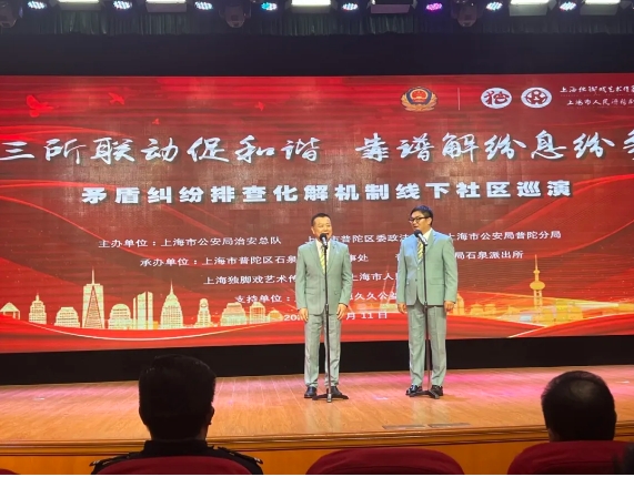 2024年11月14日 来源: 石泉路街道为深化矛盾纠纷多元化解,全力推进“三所联动”机制建设,坚持和发展新时代“枫桥经验”,11月11日下午,由上海市公安局治安总队、上海市普陀区委政法委、上海市公安局普陀分局主办,石泉路街道办事处、石泉路派出所及上海独脚戏艺术传承中心(上海市人民滑稽剧团)承办的“春风化雨暖人心、三所联动解心结”——矛盾纠纷排查化解机制线下社区巡演在街道文化中心开演。